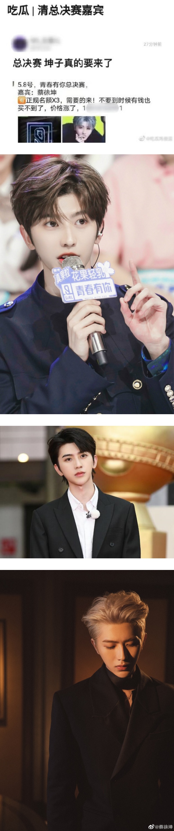 《青春有你3》(青你3)即将迎来总决赛,网上也陆续传出总决赛训练生的分组名单,此外有传蔡PD(蔡徐坤)将在总决赛舞台回归,担任成团见证人。