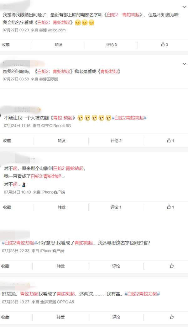 这个错误让网友哭笑不得,也有人表示“劫”和“勃”写法确实很像,自己也曾看错:“我觉得我眼睛出问题了”、“我总是容易把这个名字看成青蛇勃起”、“不能让我一个人被洗脑”、“对不起,原来那个电影叫白蛇2:青蛇劫起...”