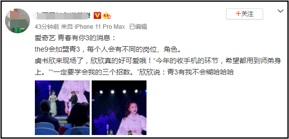 另外,THE9成员虞书欣也现身招商会站台,公布THE9将加盟《青春有你3》,且每个人会有不同的岗位、角色,更现场爆料自己当时参赛时藏手机的三个地方:面膜袋、米糊包装袋、破洞牛仔裤。