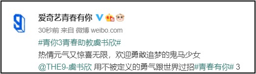 《青春有你3》在11日早官宣,虞书欣真的会担任节目的“青春助教”:“热情元气又惊喜无限,欢迎勇敢追梦的鬼马少女;@THE9-虞书欣 用不被定义的勇气跟世界过招。”