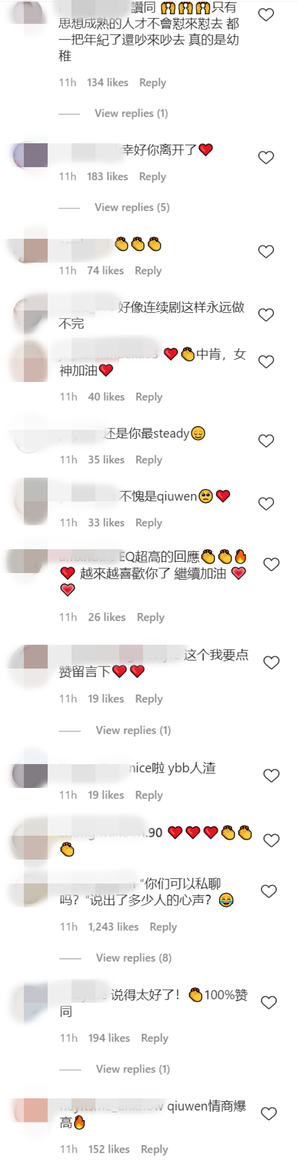 贴文曝光后不到12小时,秋雯获得大批网友留言、转发贴文力挺,“你们可以私聊吗?说出了多少人的心声?”、“说得太好了!?100%赞同”、“幸好你离开了”、“还是你最steady”、“EQ超高的回应”等。