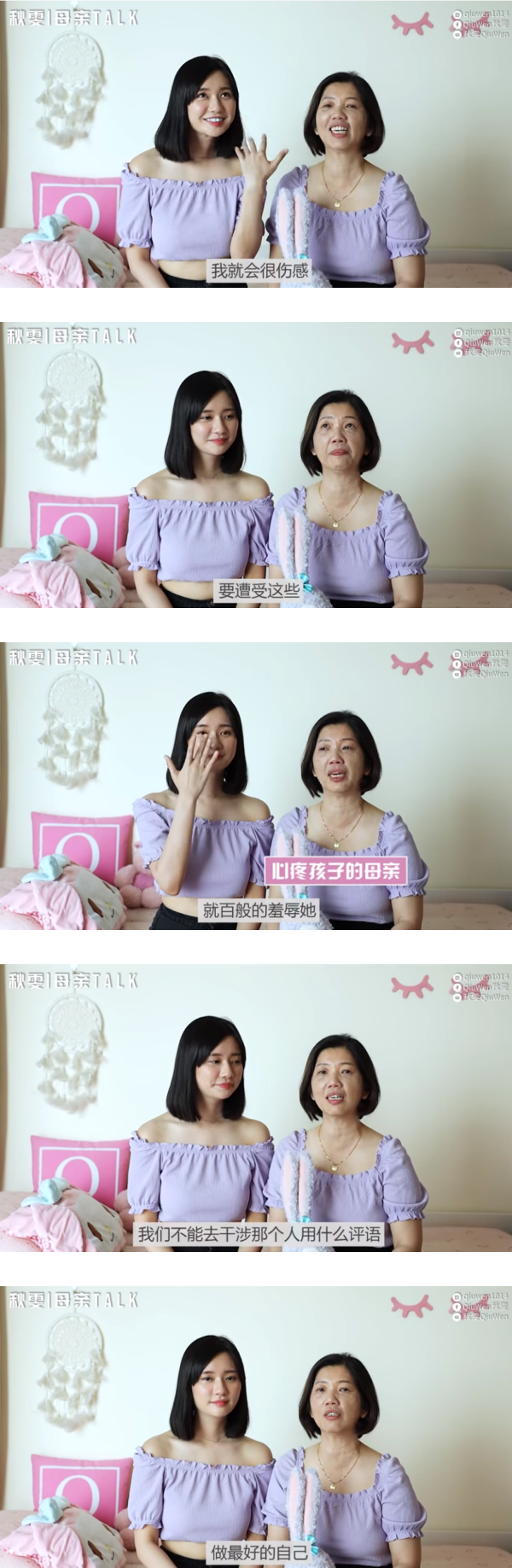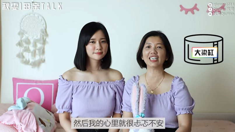 秋雯和妈妈近日穿着同款紫色上衣出镜,首次拍摄母女访问影片。在影片一开始,秋雯妈妈爆料女儿小时候很爱睡觉、直到9岁还在用奶瓶喝奶等趣事,画面非常温馨。