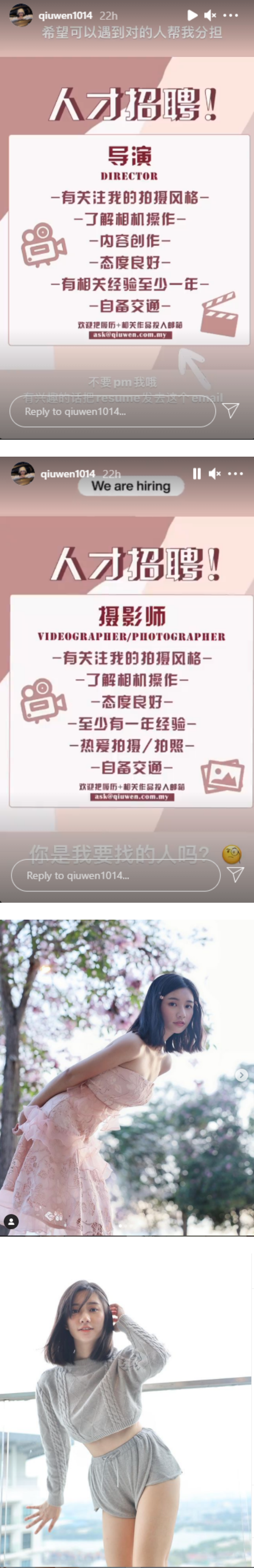 秋雯昨天(2日)在IG story发文,宣布要招聘导演、摄影师,并诚意写道:“希望可以遇到对的人帮我分担”、“你是我要找的人吗?”