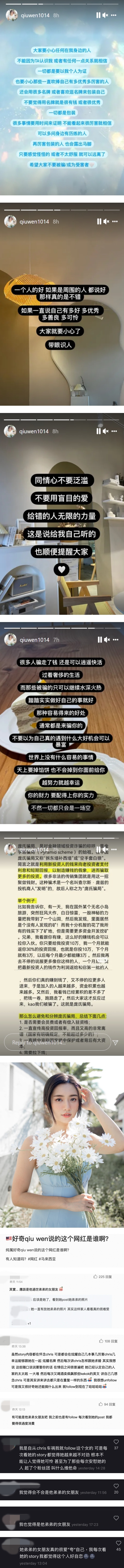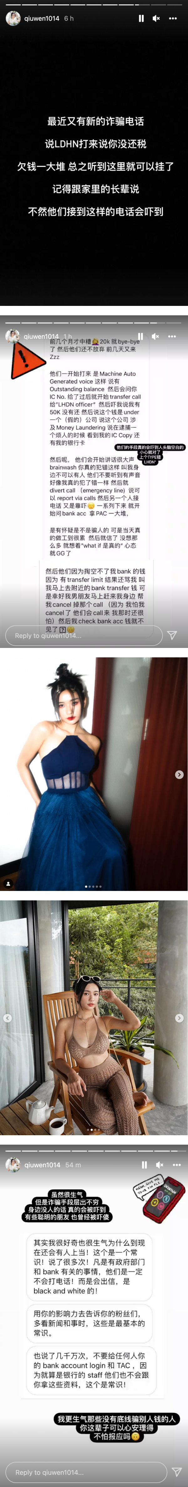 大马著名网红、YouTuber秋雯不时在Instagram上发放美照和粉丝互动,16日她在IG Story上发出3则贴文,除了提醒粉丝们小心近期非常猖狂的诈骗电话,还暗讽了“骗了钱还可以逍遥快活”的身边人!