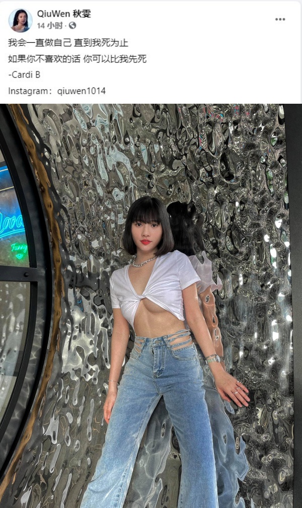 另一边厢,秋雯在Facebook上也同样发放相关照片,但帖文上她就套用Cardi B说过的话,“我会一直做自己 直到我死为止 如果你不喜欢的话 你可以比我先死”,惹来网友热议。