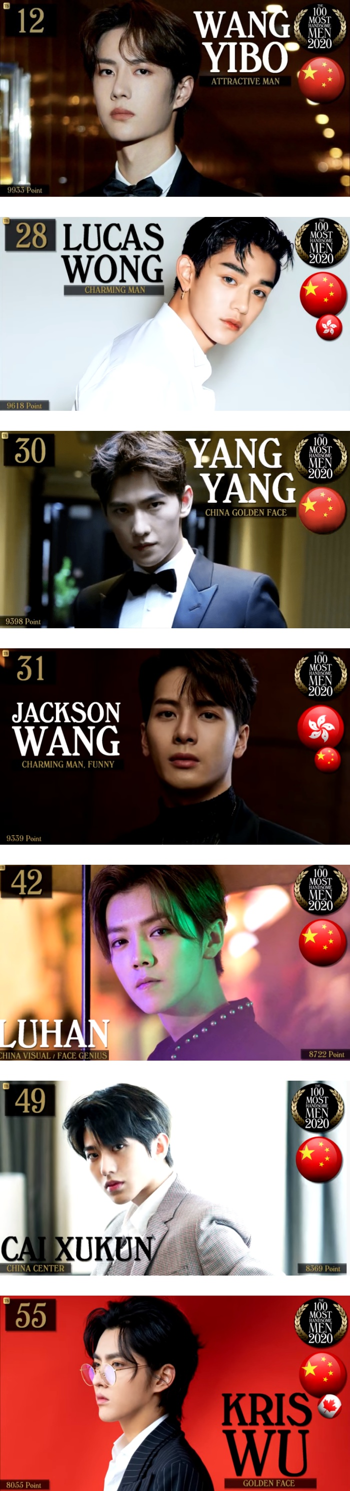 在中国方面,肖战夺下冠军,紧随其后的就是拿下第12名的王一博。其他上榜的包括黄旭熙(第28名)、杨洋(第30名)、王嘉尔(第31名)、鹿晗(第42名)、蔡徐坤(第49名)、吴亦凡(第55名)。