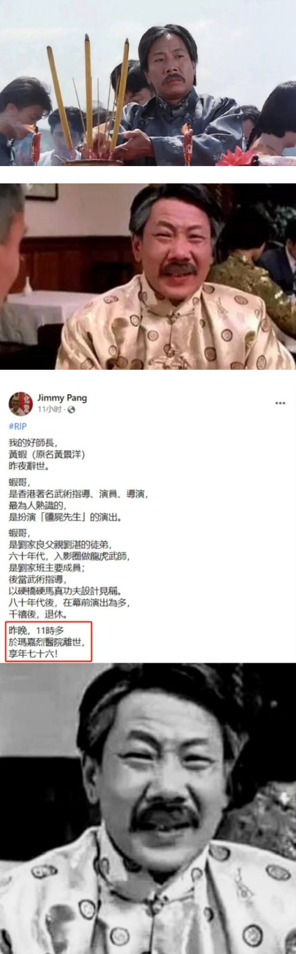 香港资深演员黄虾凭《僵尸先生》“任老爷”一角让观众留下很想,29日有消息传出指,他在睡梦中离世,终年76岁。