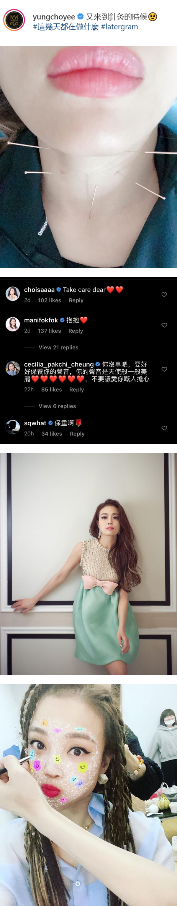 容祖儿喉咙插针的照片曝光后,圈内好友阿Sa(蔡卓妍)留言要她好好保重,有份参与《浪姐2》比拼的张柏芝则留言关心,“你没事吧,要好好保养你的声音,你的声音是天使一般美丽,不让让爱你的人担心”;网友也纷纷叮咛容祖儿要照顾好自己。