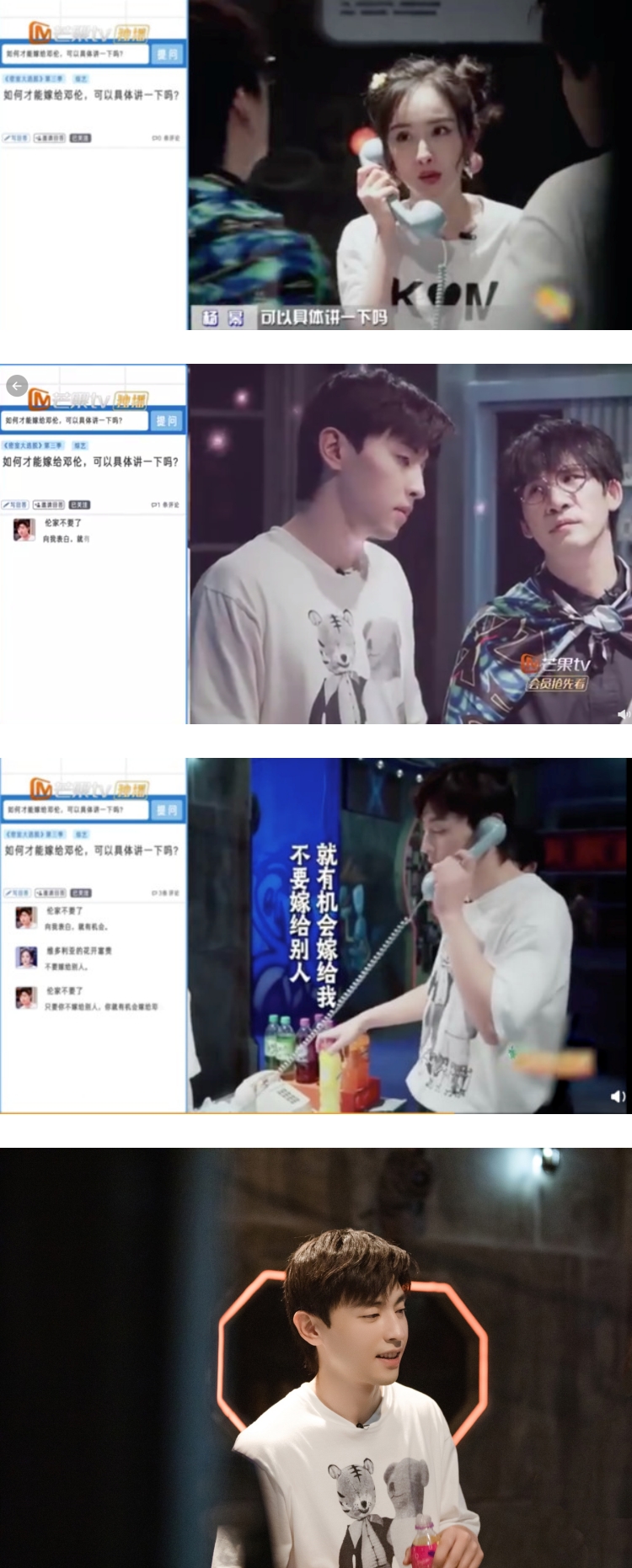后来当他拿到话筒要亲自回答时,一旁的杨幂冷不防冒出一句:“不要嫁给别人”,而邓伦也马上接收完美答案,回答:“只要你不嫁给别人,你就有机会嫁给邓伦”,神回复让不少粉丝笑翻,纷纷表示:“你等着,表白肯定会淹没你”、“邓伦你等着我”、“哥,人太多了怎么办”。