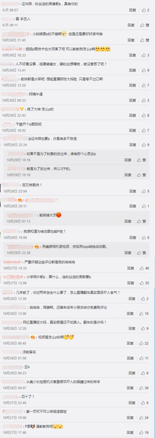 不少网友看到她在直播间的真实颜值后,纷纷留言抨击:“小学照片都P,算什么”、“妳的直播和照片可以说是毫不相干”、“P图技术也太厉害了,可以教教我怎么P吗”、“百万修图师”。