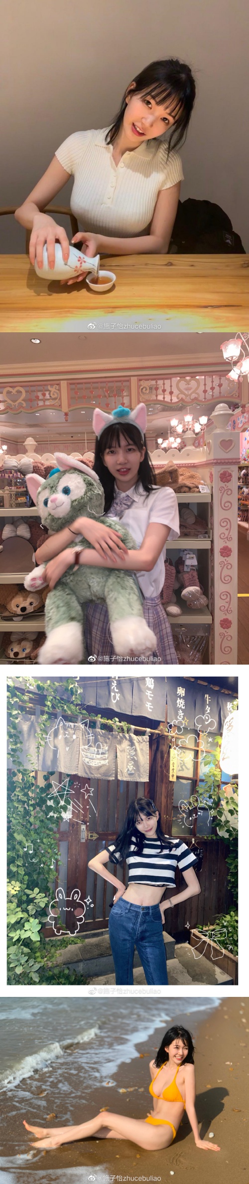 施子怡在微博拥有135万粉丝,不时晒出许多美照或穿着比基尼的辣照,身材看起来相当火辣,而样貌也甜美迷人,颜值相当高。而且她曾在微博晒出证件照与从小到大的照片,看起来差异不大,因此吸引了众多粉丝。