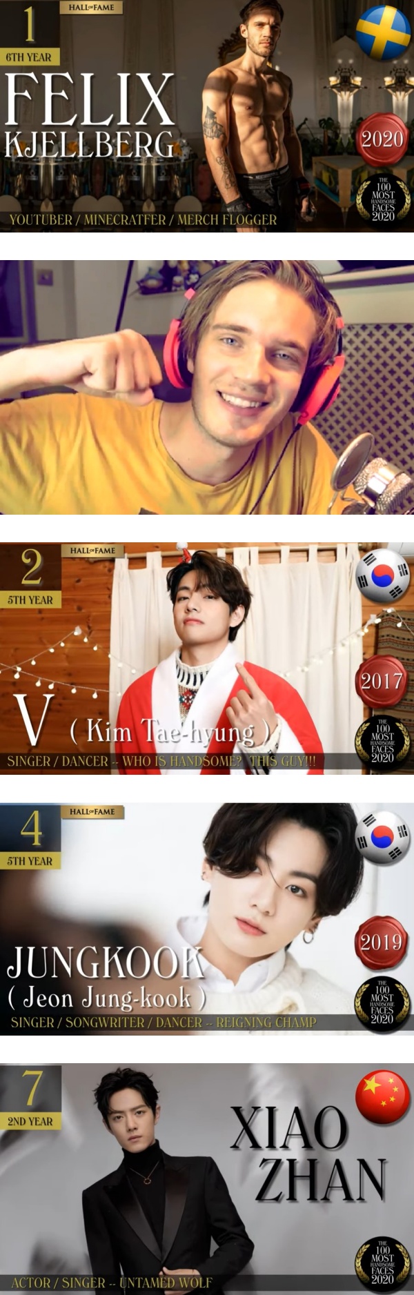 在2020“全球百大帅哥”中,来自瑞典的知名YouTuber“PewDiePie”Felix Kjellberg打败众人夺得了冠军位置,BTS的V排在第二名,2019年的最帅脸孔BTS田柾国排位掉到第四名,在一众中国代表中,肖战排在第七名。