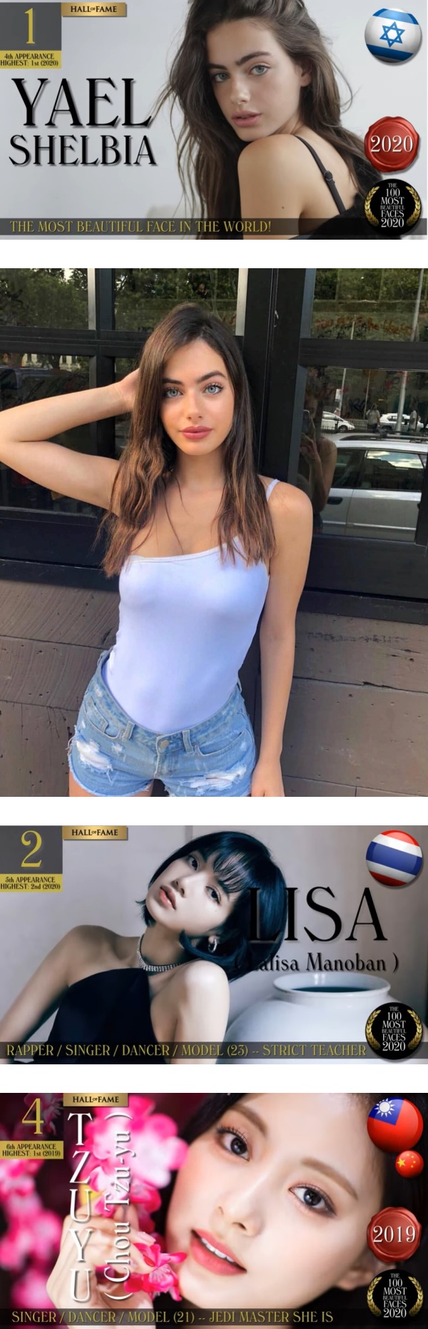另外,在2020“全球百大美女”中,排在第一名的是以色列女星Yael Shelbia,BLACKPINK的成员Lisa排在第二位,TWICE成员子瑜则排在第四名。