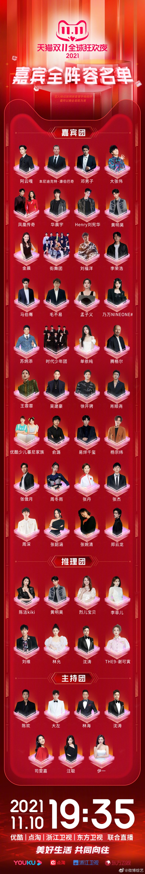 “天猫双11全球狂欢夜”将在10日晚举行,官博在9日早公开出席艺人阵容,一起看看吧!