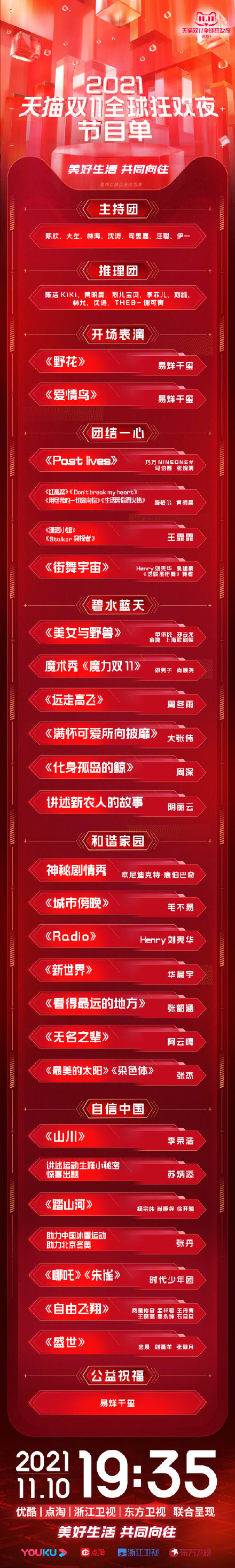 “天猫双11全球狂欢夜”将在晚上7时35分开始,由易烊千玺带来开场表演以及最后的公益祝福,其他艺人则被分为不同的主题陆续出场。THE9成员谢可寅担任“推理团”其中一员,不过节目单上并没有说明她有演出。