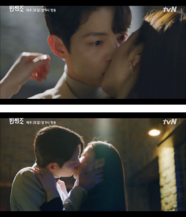 在最新一集中,宋仲基与全汝彬在一项任务中装扮成新婚夫妇,必须潜入美术馆。不料却因任务要求被迫与全汝彬接吻,没想到个性强势的全汝彬竟然主动出击,两人假戏真做,还真的亲下去了!两人在影集中亲了长达70秒,非常浪漫。