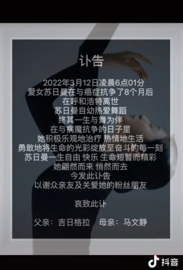 经过8个月的抗癌路程,苏日曼最终还是在今年3月12日不敌病魔离世,享年28岁。她的父母在社交网发布以女儿柔美舞姿为底图的讣告:“2022年3月12日凌晨6点01分,爱女苏日曼在与癌症抗争8个月后,在呼和浩特离世,苏日曼自幼热爱舞蹈,一生与舞为伴。”