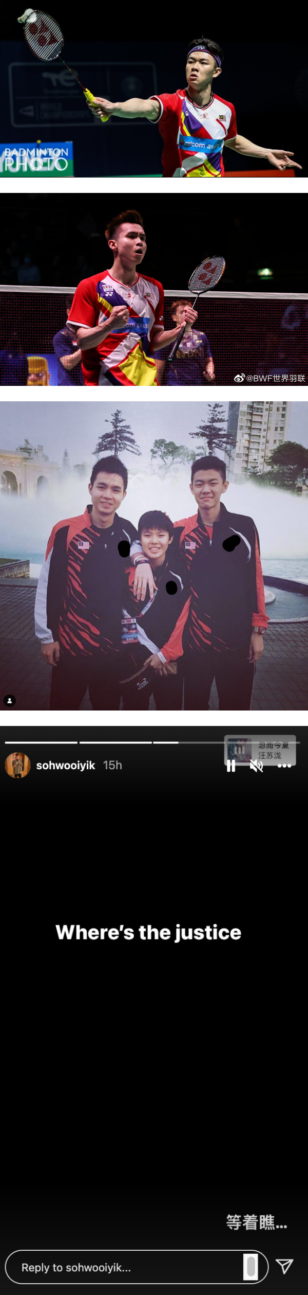 在李梓嘉被禁赛前,一起征战多年的好兄弟苏伟译表示会尊重李梓嘉的决定,并等待大马羽总的新闻发布会结果。怎料在结果出炉后,他直接在社交平台发出汪苏泷的歌曲《忽而今夏》,并写下:“Where’s the justice,等着瞧”,疑似喊话李梓嘉。