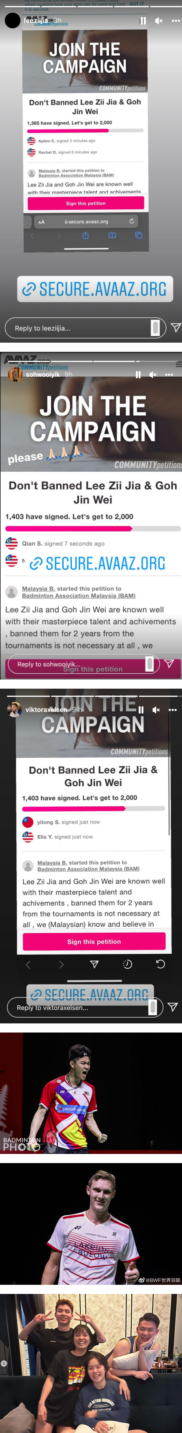 不仅如此,大马羽总在宣布禁赛李梓嘉及吴堇溦两年后,网上发起了请愿书。李梓嘉,吴堇溦都分别在自己Instagram story发起了这项请愿。苏伟译和安赛龙等球员都分享了请愿书。请愿书还没到24小时,截止到今早10点,目前已经超过4万名网友请愿。
