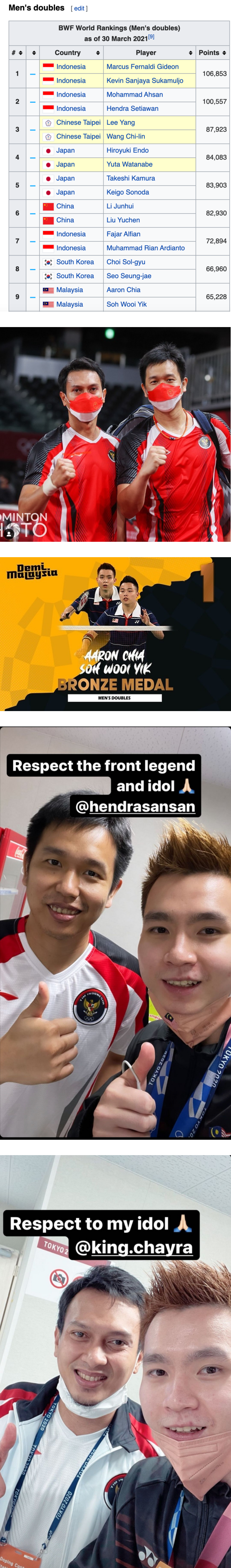 尽管击败了对手,苏伟译在比赛结束后化身小粉丝跟自己的偶像“爸爸组合”Mohammad Ahsan 和Setiawan 合照,并表示两人是男双的楷模。从他们欣喜的笑容看来,这一份友谊显然已经超过了比赛的胜负。