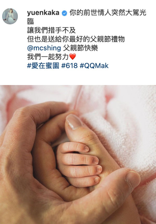 她兴奋得贴出了夫妻俩握住女儿小手的照片并对老公喊话:“你的前世情人突然大驾光临,让我们措手不及,但也是送给你最好的父亲节礼物,祝你父亲节快乐,我们一起努力”。