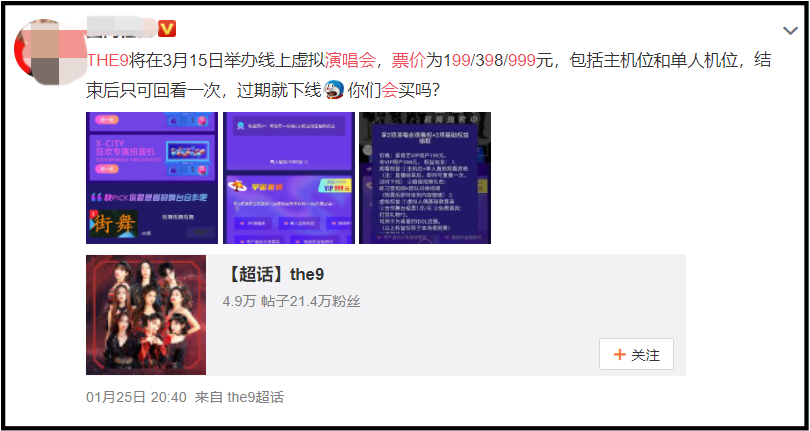 虽然刘雨昕并没有透露过多关于演唱会的讯息,但翻看网传消息,早在1月就有爆料,指THE9将在3月15日举办“沉浸式虚拟现实”的线上演唱会。让我们一起期待吧!