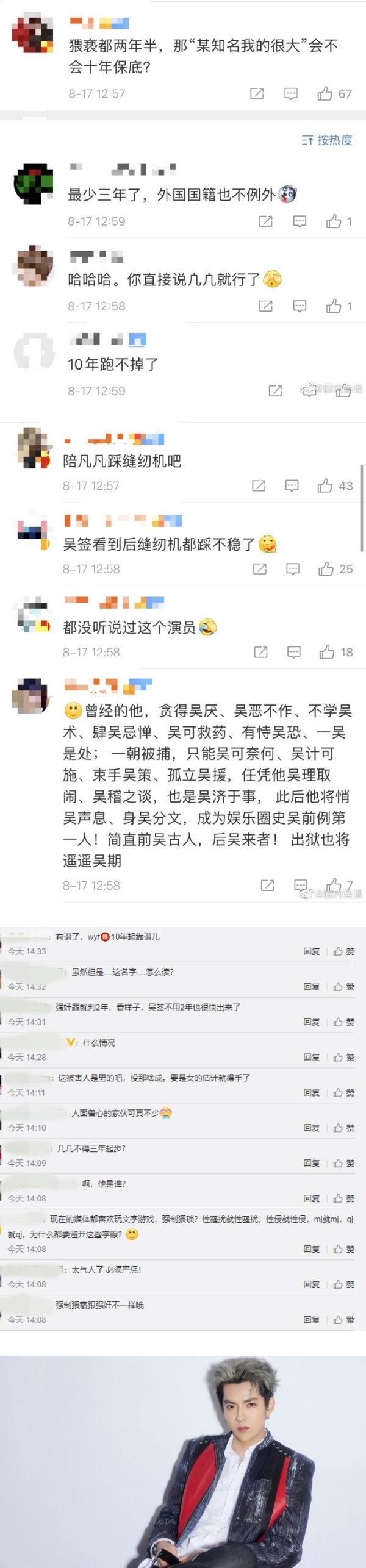 另外,有网友好奇因为涉嫌强奸罪遭逮捕的吴亦凡,需要过上多久的牢狱生活:“猥亵都两年半,那‘某知名我的很大’会不会十年保底”、“最少三年了,外国国籍也不例外”、“陪凡凡踩缝纫机吧”、“凡凡是强奸不是猥亵,三年起步”、“搞专业不认识,犯罪了却认识了,太讽刺了!”。