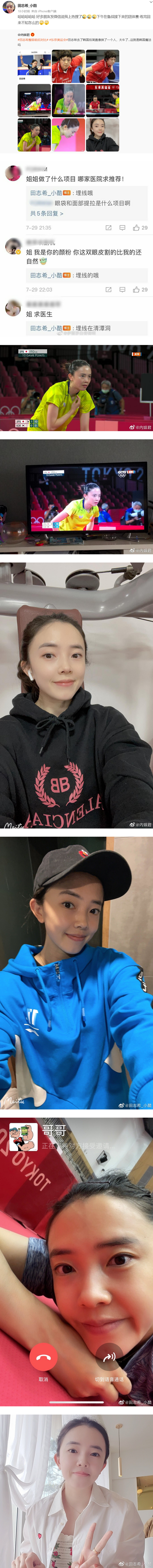 田志希其后也转发对比照的微博,高情商回应:“哈哈哈哈哈,好多朋友发微信说我上热搜了,下午在备战接下来的团体赛,练完回来不知怎么的”,并大方承认自己确实有整容,做了埋线双眼皮,纹发际线、普拉提、医美等。