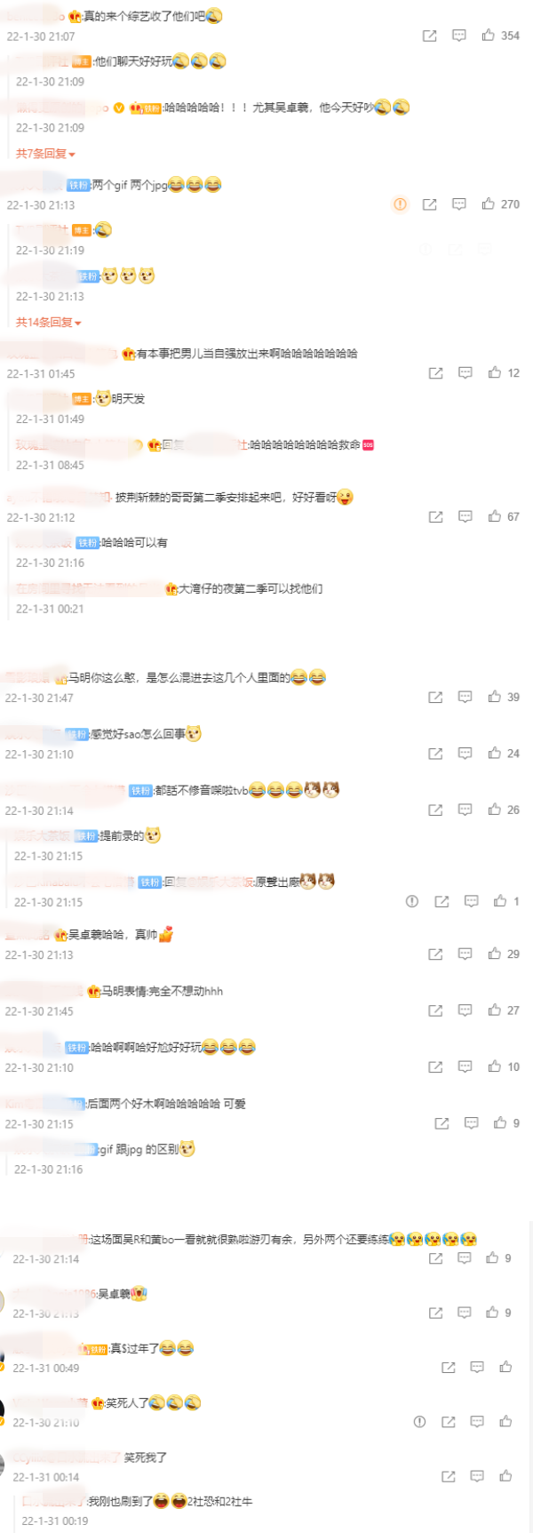 网友表示喜欢4人的综艺感:“真的来个综艺收了他们吧”、“大湾仔的夜第二季可以找他们”、“哈哈啊啊哈好尬好好玩”、“又吵又好笑 还要动起来哈哈哈哈哈哈”、“黄宗泽太帅,看的出在努力收敛了,想看他好好跳”、“吴卓羲真的笑死我哈哈哈哈哈”、“你看那个马国明满脸写着我想回家”、“这场面吴R和黄bo一看就就很熟啦游刃有余,另外两个还要练练”。