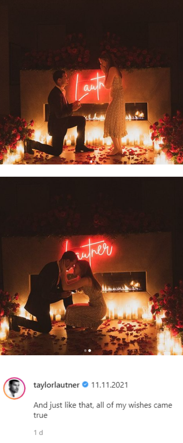 Taylor Lautner在IG晒出在一片烛光、玫瑰中跪地求婚的照片,表示自己所有的心愿都已成真。他在2018年9月和小5岁的Tay Dome认爱,并在今年11月11日求婚成功。