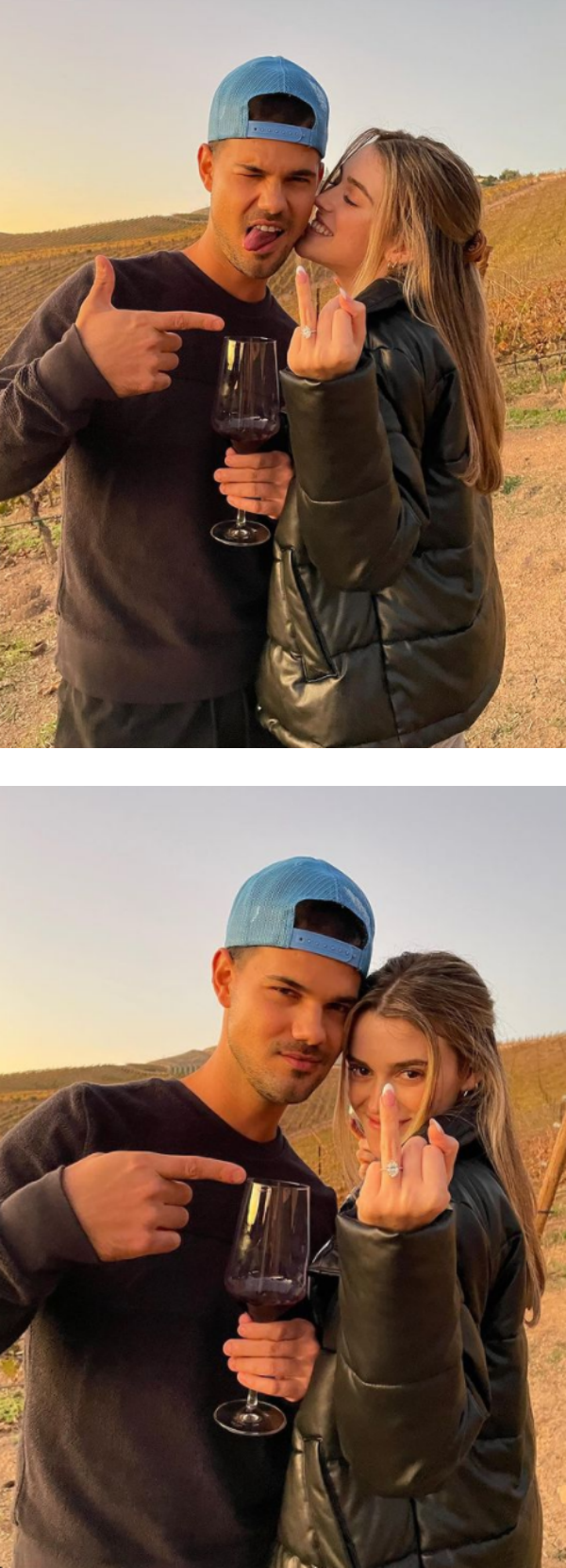 15日,Taylor Lautner再透过IG晒出和女友的合照,只见女方俏皮地向镜头展示无名指上的钻戒。
