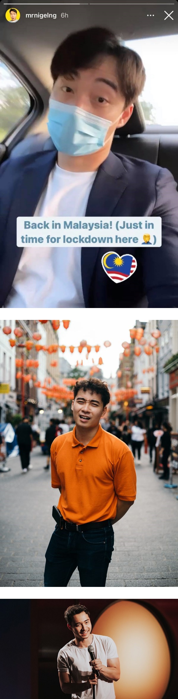 Uncle Roger在Instagram专页上更新限时动态,穿着西装外套的他,戴着口罩对镜头打了打眼色;动态上写着,“Back in Malaysia! (Just in time for lockdown here) ”。