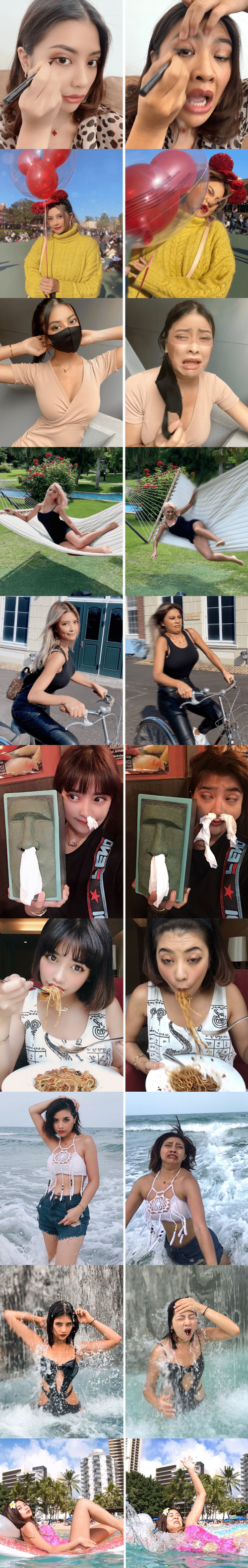 来自泰国的Vienna 在Twitter释出一系列“人前VS人后”的崩坏对比照,原来很多羡煞网友的美照,也是会被拍下崩坏的NG照,超强的反差感让她迅速走红。