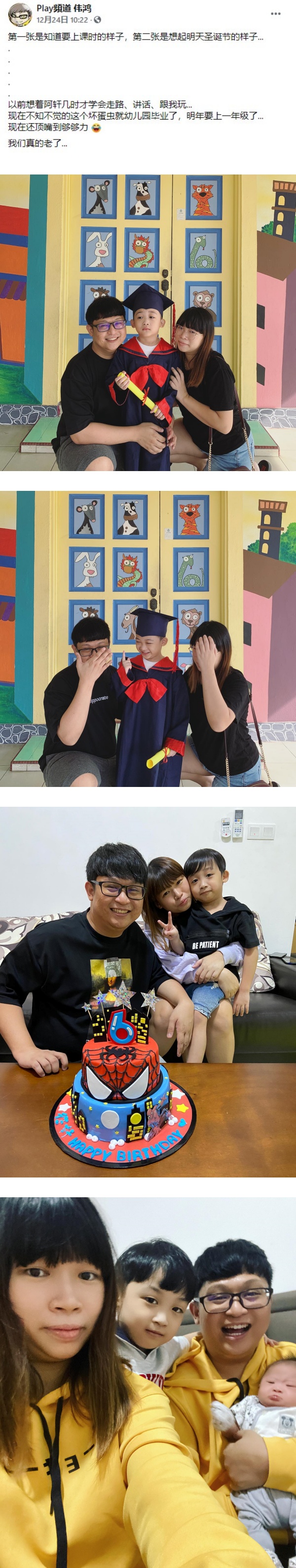 伟鸿笑说,以前总是在想儿子几时会学走路、说话跟自己玩,转眼间如今这个“坏蛋虫”要幼儿园毕业了,现在还牙尖嘴利不时和自己顶嘴,让伟鸿忍不住叹说,“我们真的老了”。