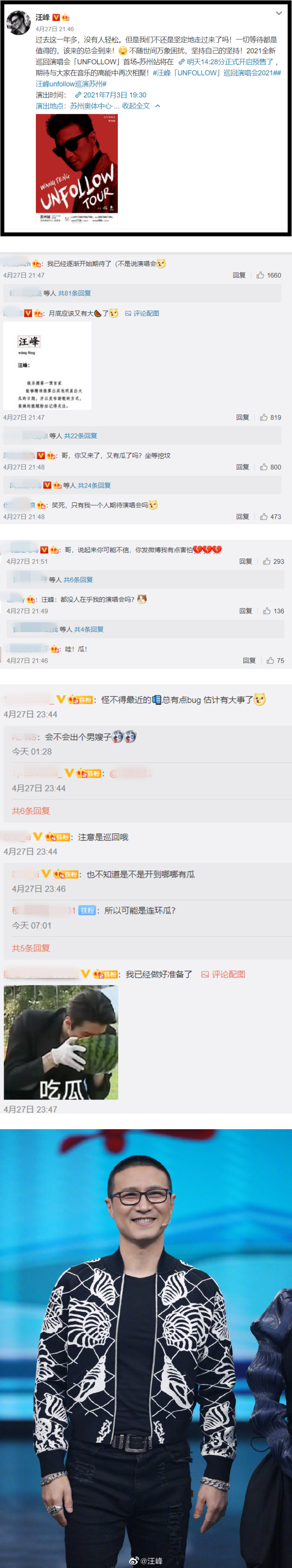 太笋了!中国歌手汪峰昨晚(27日)官宣将举办巡回演唱会,并公开首场的门票预售日期,结果网友的重点却放在了吃瓜上......