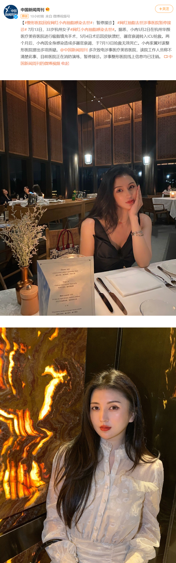 15日微博上出现了“网红小冉抽脂感染去世”的热搜词,据悉小冉在5月初在杭州的一家医美医院进行吸脂填充手术,2天后皮肤溃烂、器官衰竭被送进ICU进行抢救。经过了2个多月的抢救和搏斗,小冉最终因为全身感染造成多器官衰竭,于7月13日抢救无效死亡。