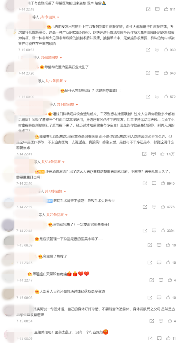 相关消息曝光后,网友留言称,“终于有官媒报道了 希望医院能出来道歉 发声 赔偿”、“希望彻底整治医美行业太乱了”、“姐妹们胖就规律饮食运动起来,千万别想走捷径吸脂”、“直接关闭吧!医美太乱了,没有一个行业规范”等。