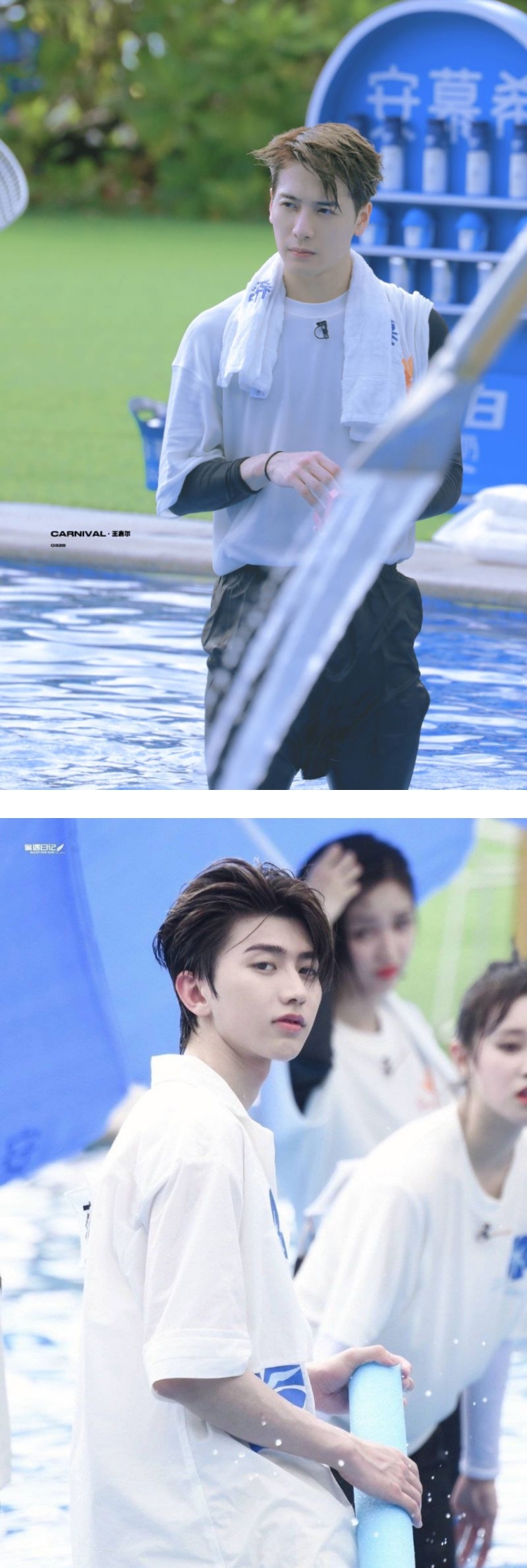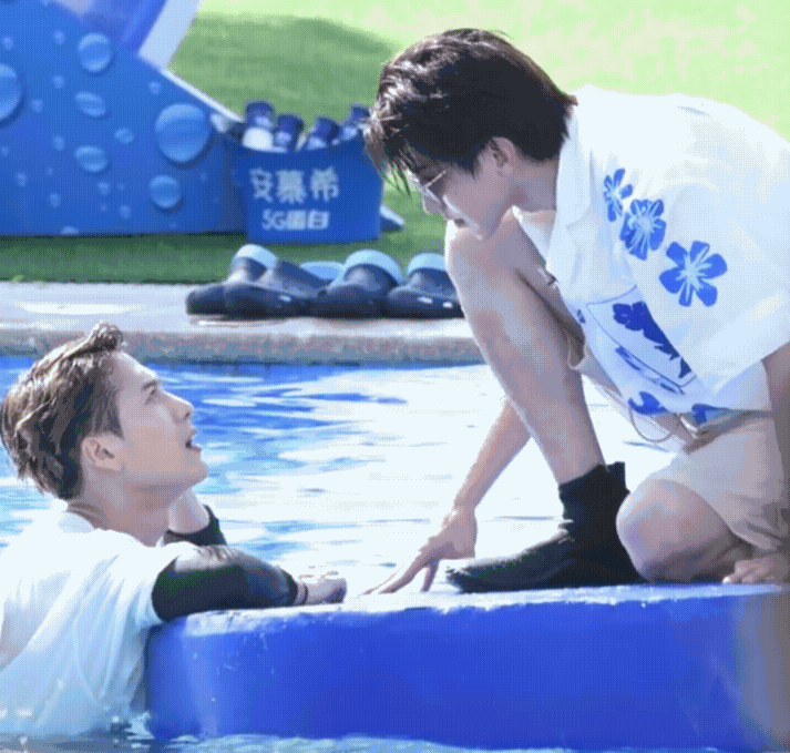 网上爆出的路透照中,只见王嘉尔站在泳池里,而蔡徐坤则蹲在浮板上,两人交谈几句后,蔡徐坤就伸手摸对方的头发,当场上演“摸头杀”!