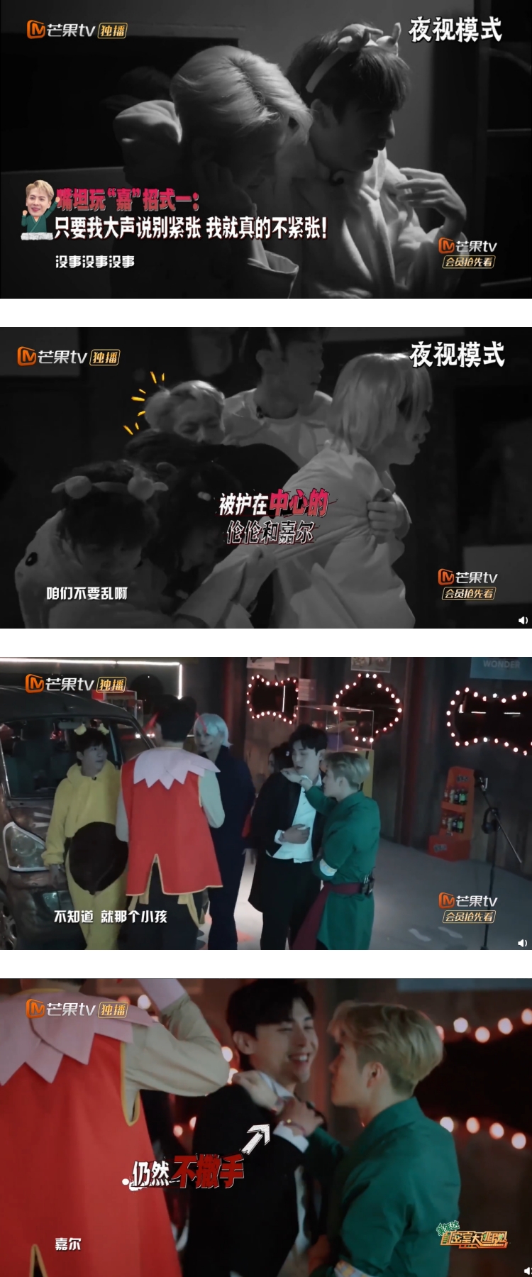 最新一期《密室大逃脱》中,王嘉尔在关灯后吓得瞬间变成“背背嘉”,嘴上说着不要慌,身体却很诚实地立刻蹲下,紧紧抱着邓伦的衣领不放,完全就是难兄难弟的感觉。