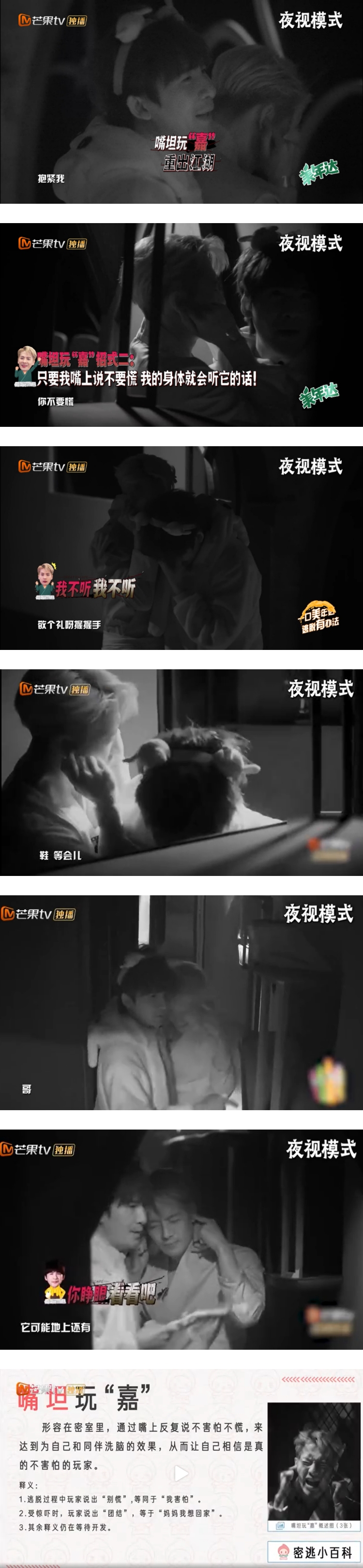 另外,当他和大张伟两人去探索时,他更是全程紧闭着眼睛,嘴巴不停念叨:“不紧张”、“不害怕”、“没有事”,密室新玩法让节目组都忍不住吐槽他是“嘴坦玩嘉”,画面非常搞笑。