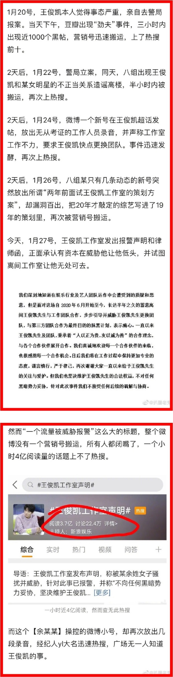 工作室发声明后迅速掀起热议,其后有网友梳理时间线发现,在王俊凯报警当天,豆瓣就出现王俊凯“劲夫”事件,起了1000个黑帖,2天后又出现“王俊凯与某知名女艺人存在不正当关系”的造谣,登上热搜,甚至在24日、26日都出现不少不利于王俊凯的造谣,让网友傻眼表示:“这一连串的预谋策划过程让人瞠目,小凯太惨了! ”