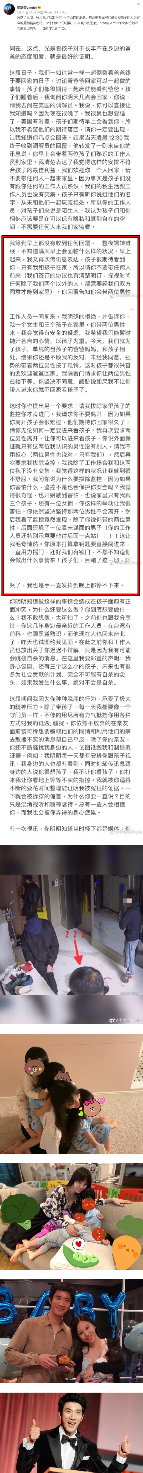 文中,李靓蕾提到孩子们一直等待爸爸回家的日子,没想到王力宏告诉她说会和2位孩子们都熟悉工作人员同行。李靓蕾多次拒绝王力宏同时指,两人签下的协议已经注明,探视时间除了两人以外的其他人,都得经过双方肯定同意才可以进家。