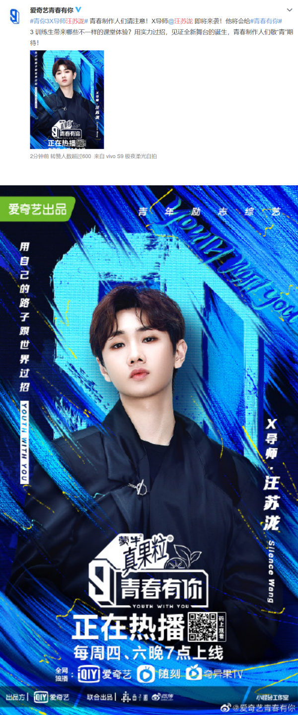 贴文中提到,“X导师”汪苏泷即将来袭,他会给训练生门带来怎样的课堂体验?并放话要各位青春制作人期待。