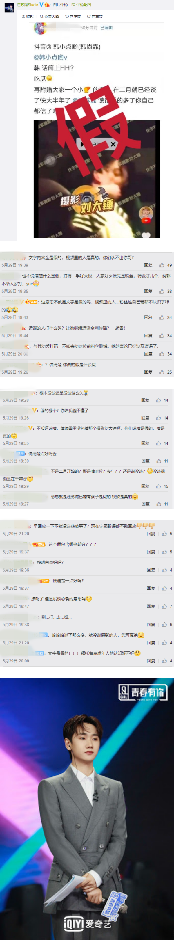 汪苏泷早前曾被拍到被一名女子抱着猛亲,而工作室也在同一篇帖文下晒出相关照片,并打下红色大字“假”。网友认为工作室态度模糊:“讲清楚 你说的假是什么假”、“辟的哪个?你给我整不懂了”、“意思就是汪苏泷已婚有孩子是假的 视频是真的”、“这个假包含哪些部分???”。