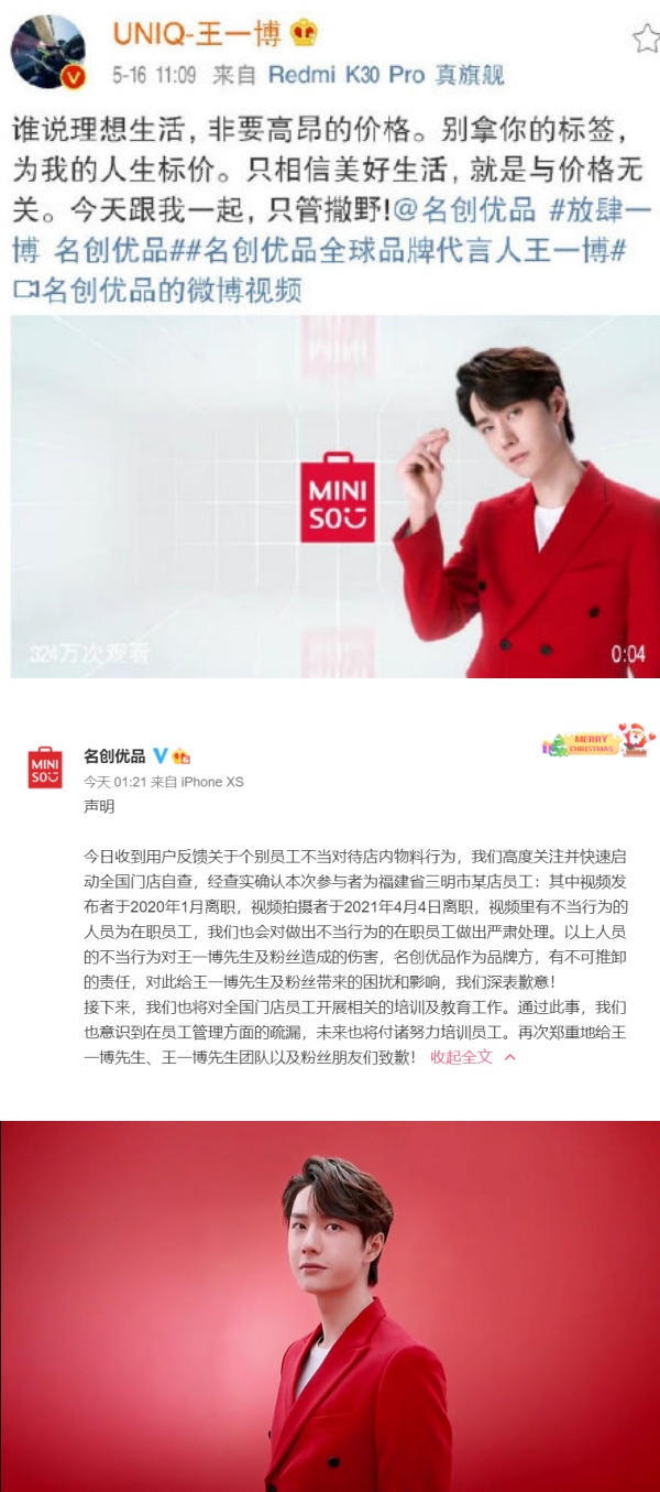 9日,MINISO官方微博发文指,经过查证已经确认是旗下店面的员工所做的事,“通过此事,我们也意识到在员工管理方面的疏漏,未来也将付诸努力培训员工。再次郑重地给王一博先生、王一博先生团队以及粉丝朋友们致歉!”