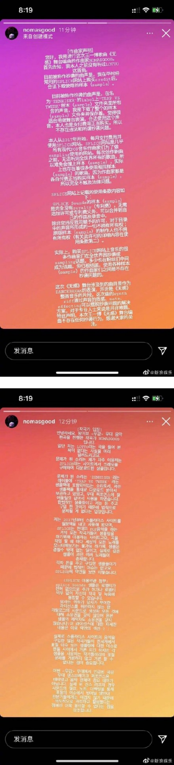 负责《无感》新舞台的韩国编曲作家NOMSSGOOD在18日晚以中、韩双语发文,否认抄袭。他表示此前从未听过《LOTTO》:“目前被称作抄袭的曲声是,我在平时经常用的网站上购买credit后,合法下载使用的样本(sample)。”该网站提供的素材都是没有专利、可以随便使用,因此不存在抄袭问题。