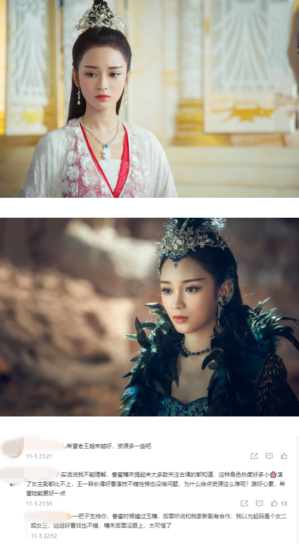 事实上,王一菲在出演《香蜜沉沉烬如霜》中的反派角色“穗禾”后引起不小的关注,因此网友认为她的热度和资源不该仅此而已:“王一菲长得好看演技不错性格也没啥问题,为什么给点资源这么难呢?”。