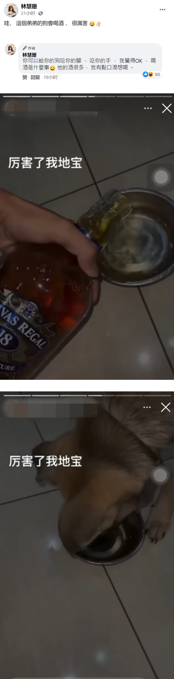 本地网红韩晓嗳日前在本名“林慧珊”Facebook账号上发布了一段视频,曝光的画面看到一位网友把烈酒倒入狗盘里,让饲养的狗儿喝;韩晓嗳暗讽对方,“你可以给你的狗吃你的脚 , 吃你的手 , 我觉得OK , 喝酒是什么事”。