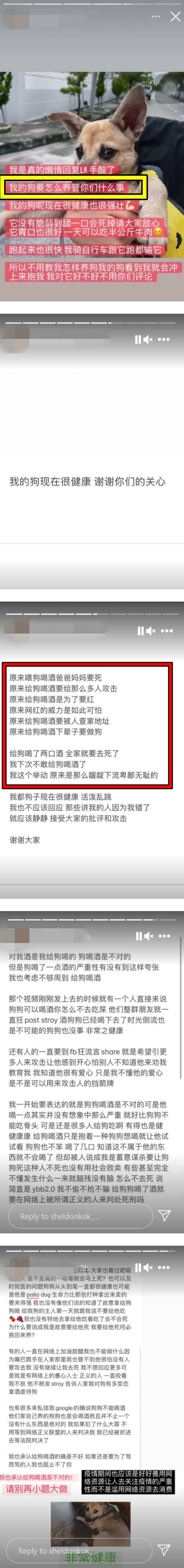 另外,韩晓嗳也在留言区附上该名网友的Instagram账号,翻看该网友的IG Story,对于因为给狗喝烈酒而遭到围剿一事,他写下,“原来喂狗喝酒 爸爸妈妈要死”、“原来给狗喝酒要给那么多人攻击”等。