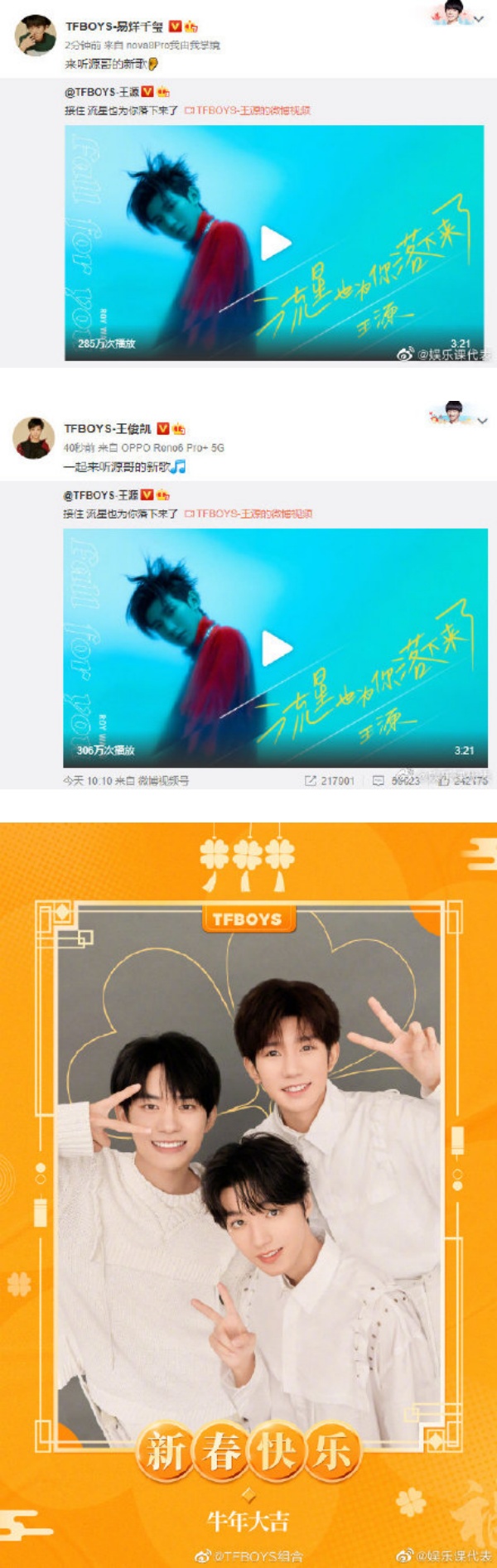 王源的新歌MV曝光后,王俊凯和易烊千玺也第一时间公开打Call,以实际行动粉碎早前传出的解散传言。